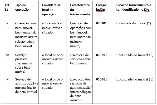 cindOp e tpOper – Códigos de operação e tipo de operação de prestação de serviços.