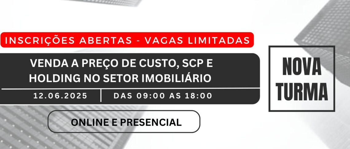CURSO ONLINE DISPONÍVEL – Tem por objetivo capacitar os participantes para que possam assimilar os conceitos e vantagens da venda a preço de custo com ou sem a utilização de Associações, com o condomínio de construção. Constituição e procedimentos de Sociedade em Conta de Participação (SCP), e a utilização de holdings como instrumento de proteção […]